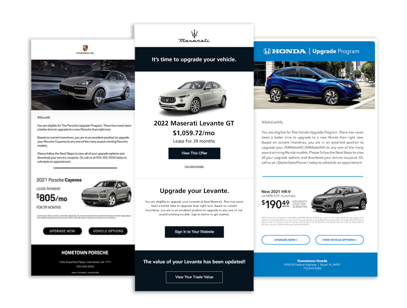 Move customers down the funnel with trigger emails designed to convert passive shoppers into active leads. These automated emails precisely re-engage shoppers based on dozens of specific customer actions. For example, after visiting your website, customers will receive an email with a personalized offer on the exact vehicle they shopped for. On the service side, customers will receive an email before their upcoming appointment with customized upgrade offers and vehicle appraisal options. Smart Emails are 100% automated with personalized content tailored to every customer. These dynamic emails are impossible for CRM’s or humans to create and have 26% higher open rates than traditional emails.